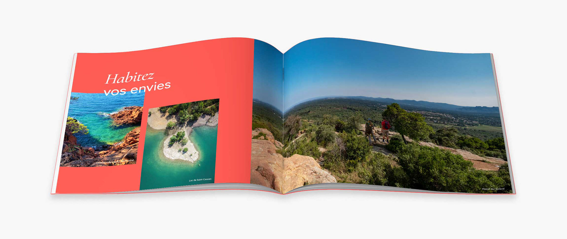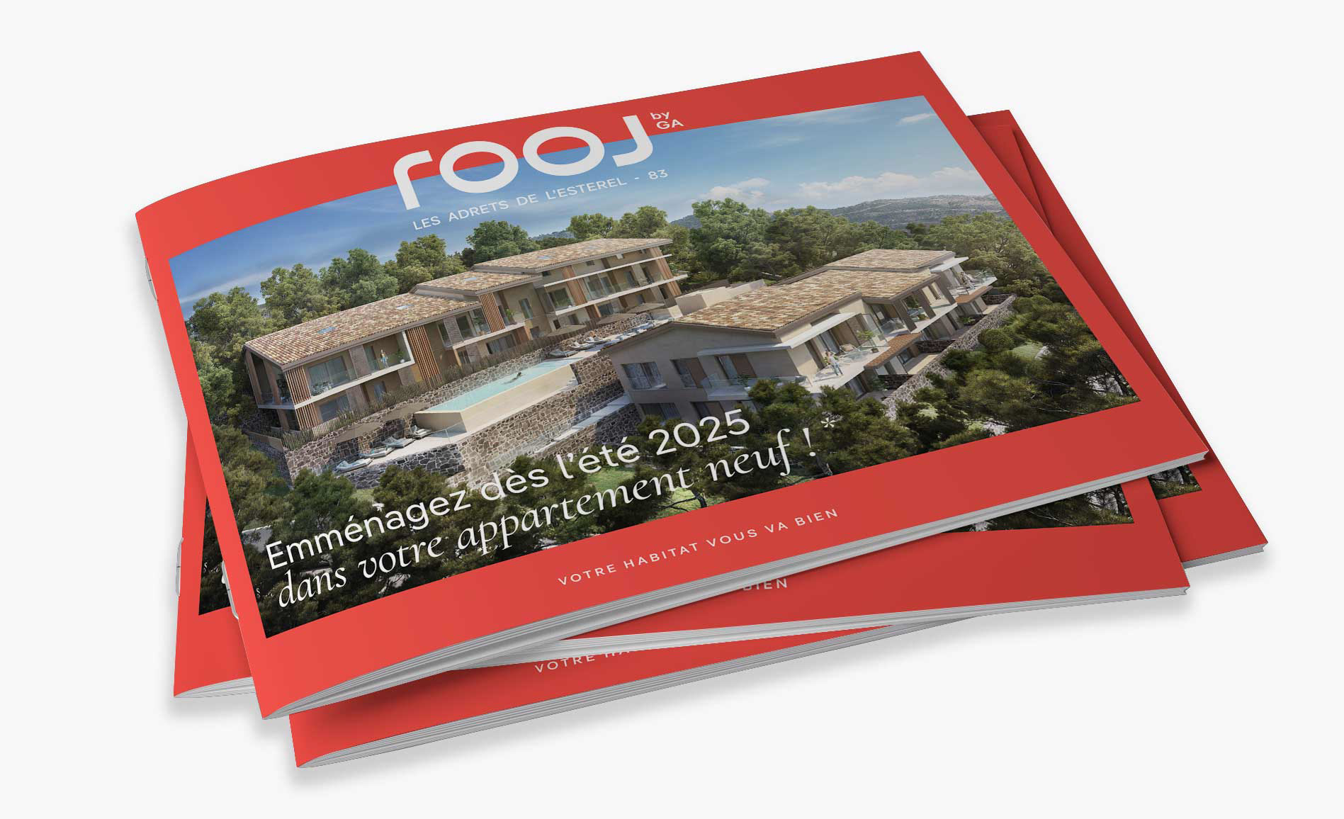 Conception graphique et mise en page des brochures pour Rooj by GA. Avec la création de pictos et cartographies